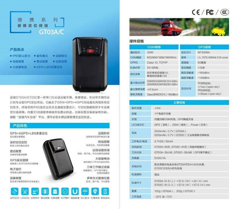 途强GT03A/GT03C是一款专门为长途运输车辆、贵重物品、刑侦等车辆而设计的专业型GPS定位终端。它融合了GSM+GPS+ AGPS无线通讯网络系统定位技术,终端采用IP65级防尘防水及强磁装置设计,可轻松隐藏吸附于车底做定位追踪用:内置3D加速度18luck登录入口实现震动防盗、位移报警及智能省电功能。