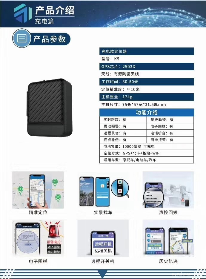无线GPS定位器简单介绍: 无线GPS定位器两种模式可实现随时切换,分为闹钟模式和追踪模式,闹钟模式是指每天有固定的时间上报,追踪模式是指连续上报。该产品在闹钟模式下的待机时间可超过1000天,强磁装置,不用可以安装,质量可靠。